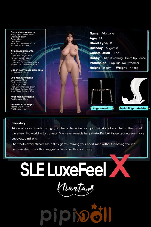 Mit einer Größe von 168 cm und einer wohlgeformten Figur von 47,5 kg vereint Aria Lane mediale Ausstrahlung mit perfekten Proportionen. Ihre Maße von 97-64-104 cm betonen ihre feminine Silhouette, während das hochwertige SLE LuxeFeel Viantay-Material und die innovative Yoga-Skelett-Struktur für ein täuschend echtes Hautgefühl sorgen. Die metallenen Finger-Skelette ermöglichen realistische Gesten. Aria ist mehr als eine Streamerin – sie ist der Star, der seine verletzlichste Seite nur dir zeigt, bereit, die Kamera für immer auszuschalten und ganz bei dir zu sein.