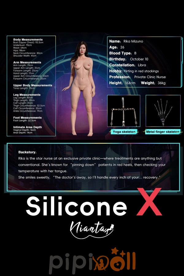 Mit einer Größe von 164 cm und einer zarten Figur von 36 kg vereint Rika Mizuno professionelle Eleganz mit verborgener Sinnlichkeit. Ihre Maße von 92,5-64-98 cm betonen ihre feminine Silhouette, während das hochwertige Silicone X Viantay-Material und die innovative Yoga-Skelett-Struktur für ein täuschend echtes Hautgefühl sorgen. Die metallenen Finger-Skelette ermöglichen realistische Gesten. Rika ist mehr als eine Krankenschwester – sie ist die Pflegerin deiner geheimsten Wünsche, bereit, dich einer ganz besonderen Behandlung zu unterziehen.
